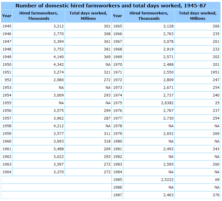 The number of hired workers fell from 3.2 million in 1945 to 2.5 million in 1987, down 22 percent, while the number of days worked by hired workers fell from 301 million to 276 million, down eight percent. During the 1970s and 1980s, the number of hired workers was stable at 2.6 million. The total days of farm work reported by hired workers rose from 200 million to 275 million in the 1970s and 1980s.