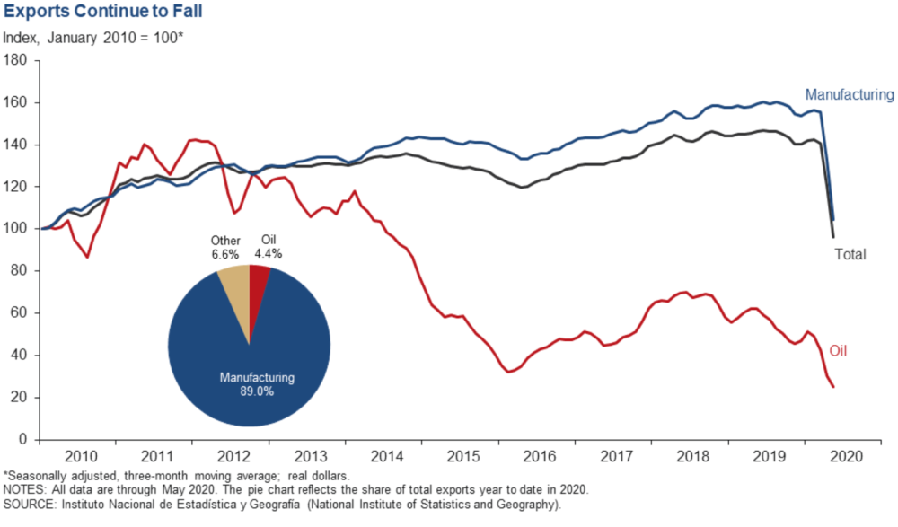 Mexico’s exports of both manufactured goods and oil dropped about 20 percent in May 2020 compared to May 2019.