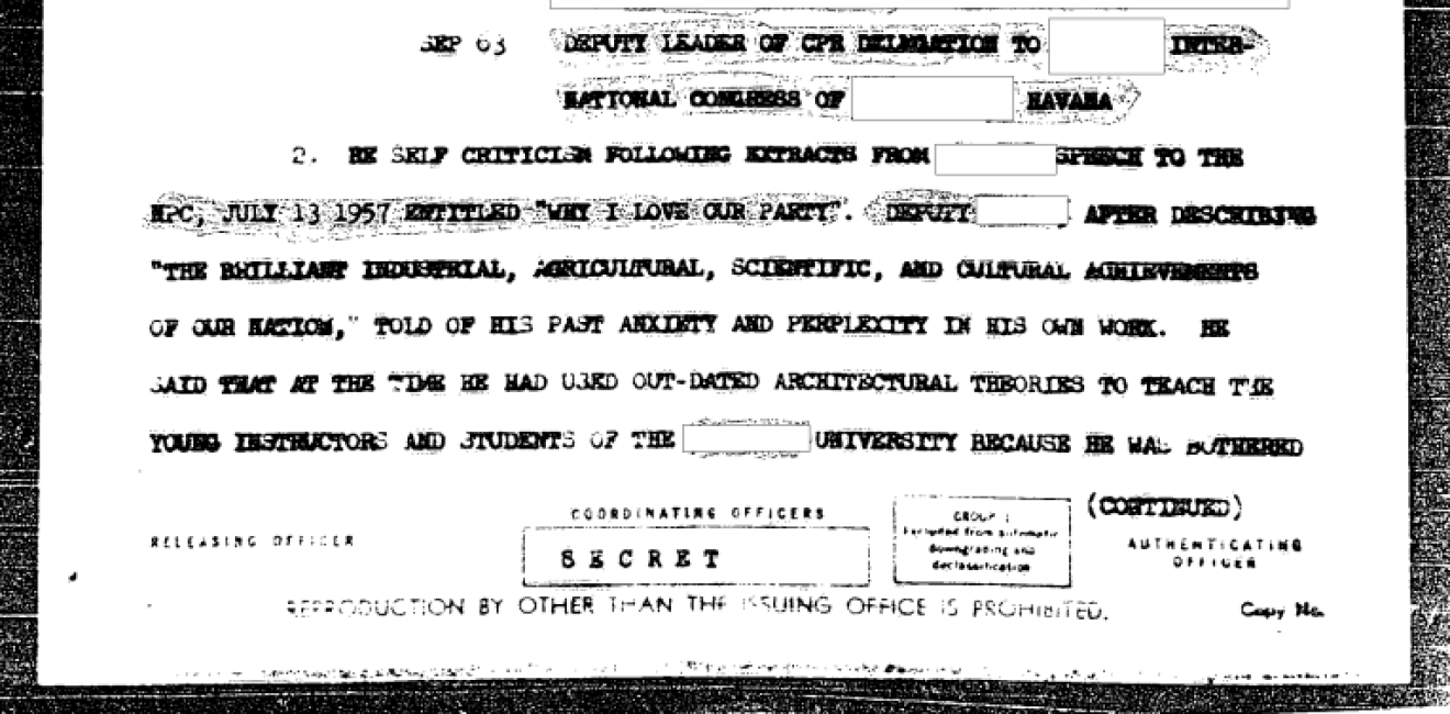 Two newly released JFK documents focused on in this essay center on US Central Intelligence Agency interest in documenting and leveraging internal dissent amongst artistic intelligentsia in the People’s Republic of China, and the CIA’s related drive to get Chinese officials to defect to the West. In the early 1960s, the Agency was collecting “case studies of disaffection” among “Chinese Communists stationed abroad or sent out on tours with delegations,” and were alert to the increase in what one internal study called “opportunities to stimulate defections.”[1]