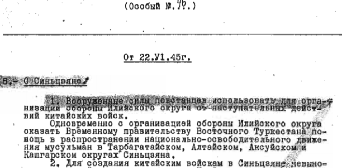 Moscow decided the fate of Xinjiang in spring 1943, when heavy combat operations on the Soviet-German front were still underway. On May 4, 1943, the VKP(B) CC Politburo adopted a secret decree titled “On Xinjiang.” The decree stated that the Soviet Union could no longer “tolerate” the Governor of Xinjiang, Sheng Shicai, and that the USSR should support non-Chinese rebels “in their struggle against the repressive colonialist policy of the Governor.” On June 22, 1945, the Politburo of the Central Committee of the Communist Party of the Soviet Union passed another decision to assist the Eastern Turkestan Republic. On September 15, 1945, the Politburo returned to the Eastern Turkestan issue, this time agreeing to act as a broker between the rebels and the Chinese government.